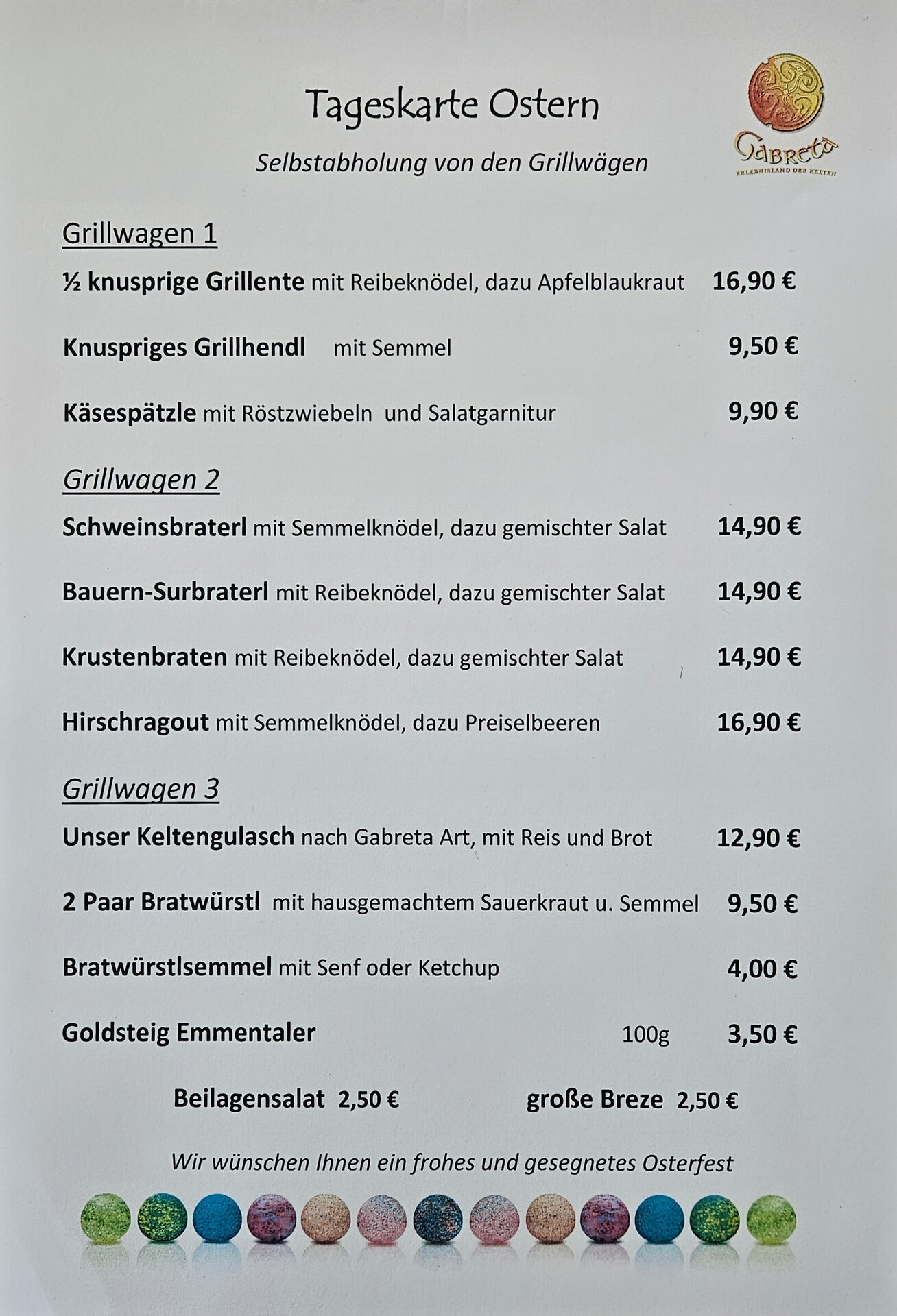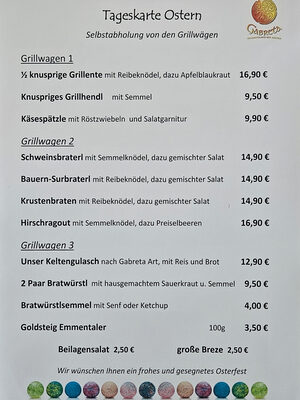Der Besitzer Rupert Kraft liefert eine Reihe verschiedener Grillspezialitäten, die wöchentlich variieren. Spareribs, Grillhaxe und -Hähnchen, Krustenbraten und an vereinzelten Tagen Ente oder Spanferkel (Anfragen über +49 (0)8555 407310, info@Gabreta.de)